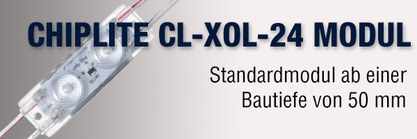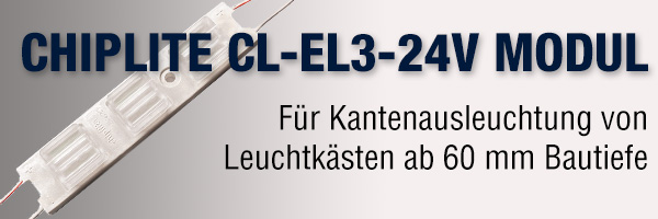 Die neuen Chiplite 24 Volt Module setzt in Sachen Effizienz neue Maßstäbe in der Lichtwerbung. Mit mehr als 140 Lumen pro Watt haben wir im Vergleich zur 12 Volt-Variante bei geringer Leistungsaufnahme mehr Helligkeit. Außerdem reduziert sich der Strom um die Hälfte, so ist es möglich die Kabelquerschnitte auch bei längeren Leistungswegen geringer zu halten.